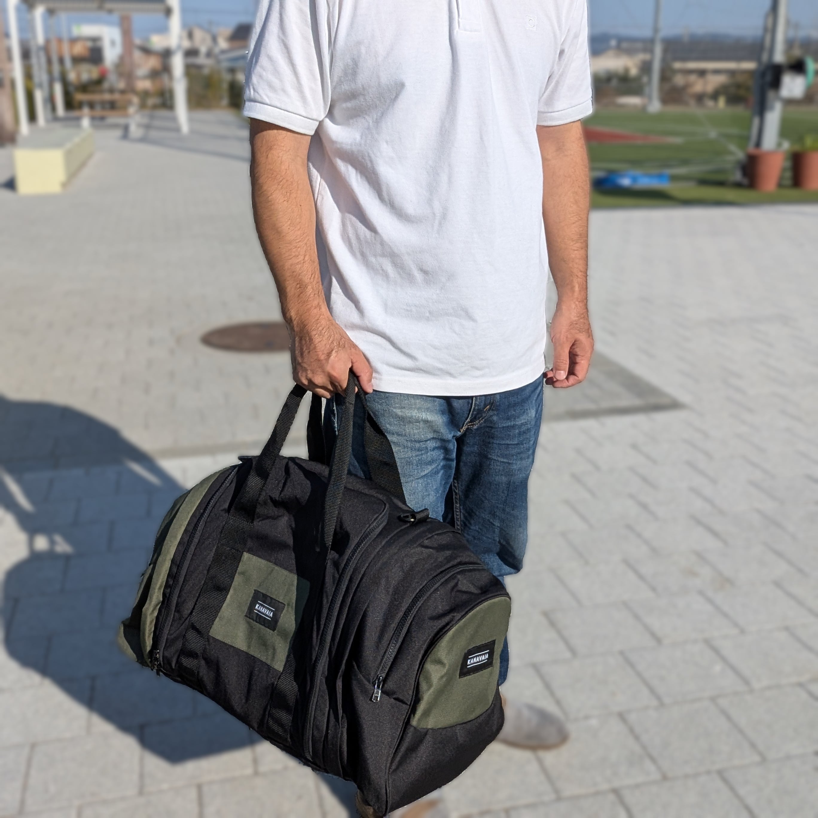3つのバッグに分解できる進化型ボストンバッグ ブラック/アーミーグリーン kanavaia